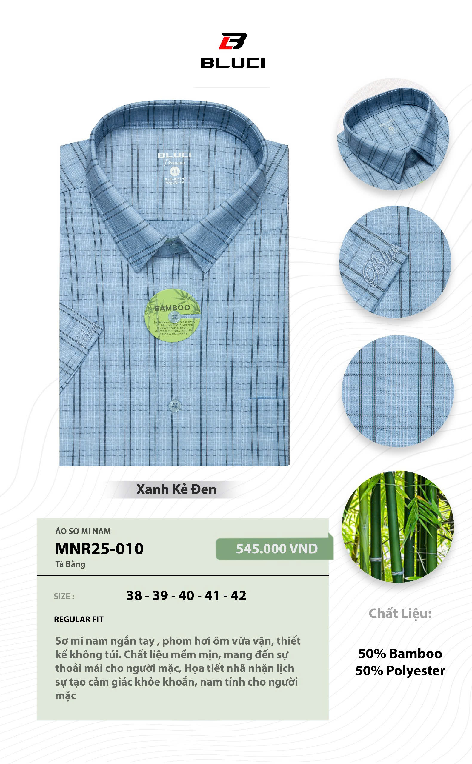 - Áo sơ mi MNR25-010 là lựa chọn lý tưởng cho phái mạnh yêu thích sự thoải mái, phong cách và tính ứng dụng cao. Với chất liệu Bamboo pha Polyester cao cấp cùng màu xanh kẻ đen trẻ trung và lịch lãm, chiếc áo này phù hợp cho nhiều dịp, từ môi trường công sở đến đi chơi, dạo phố, mang lại vẻ ngoài năng động và cuốn hút.