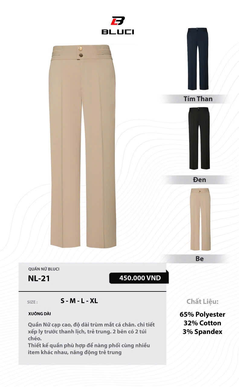 - Form dáng: Quần âu nữ ống suông cạp cao classic thích hợp cho các nàng đi làm, đi dạo phố.